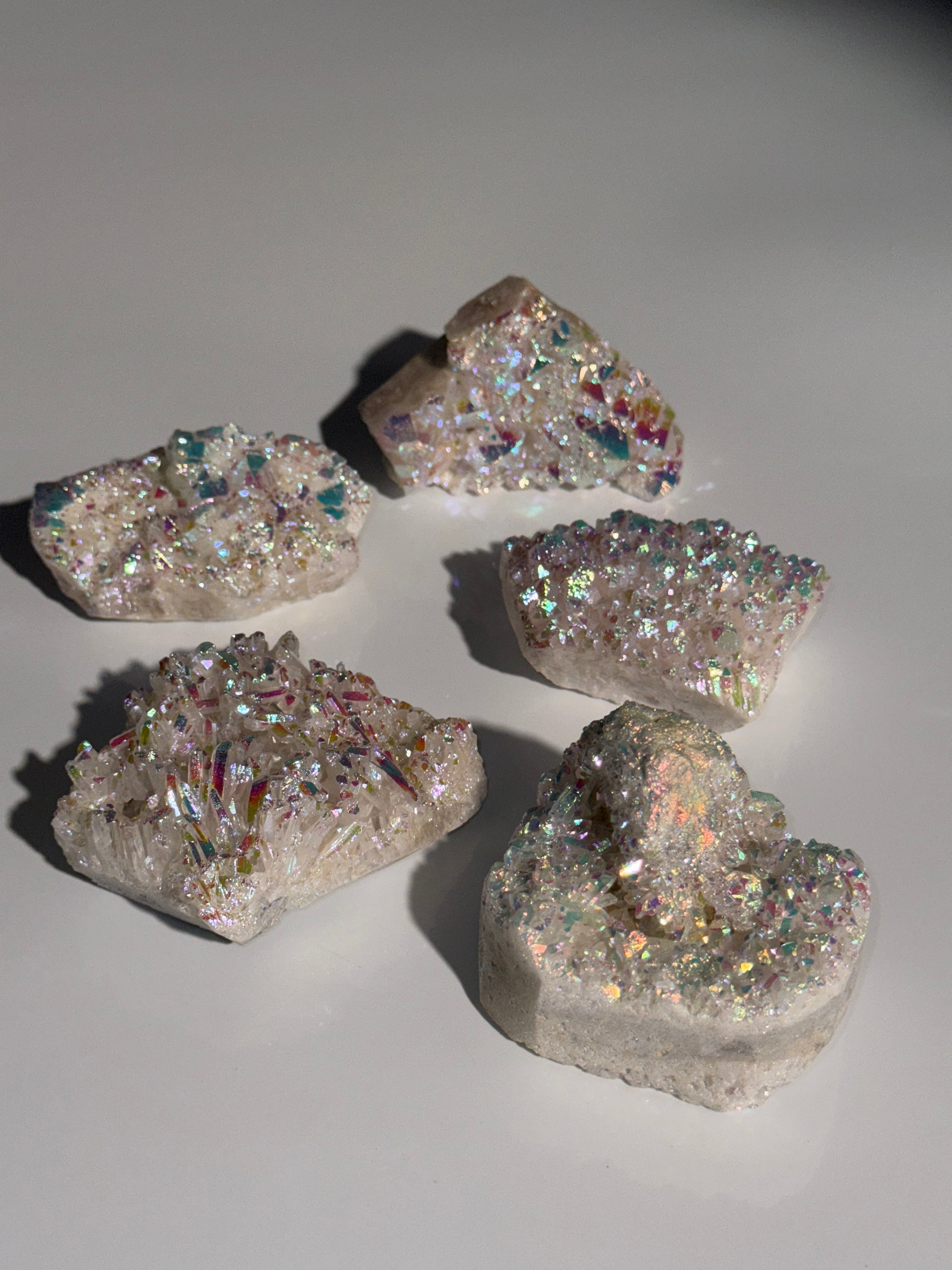 - Angel Aura Beschichtung: Bei dieser Behandlung werden die Kristalle mit einem feinem Nebel aus Edelmetall überzogen. Dies verleiht ihnen einen glänzenden, irisierenden Effekt.